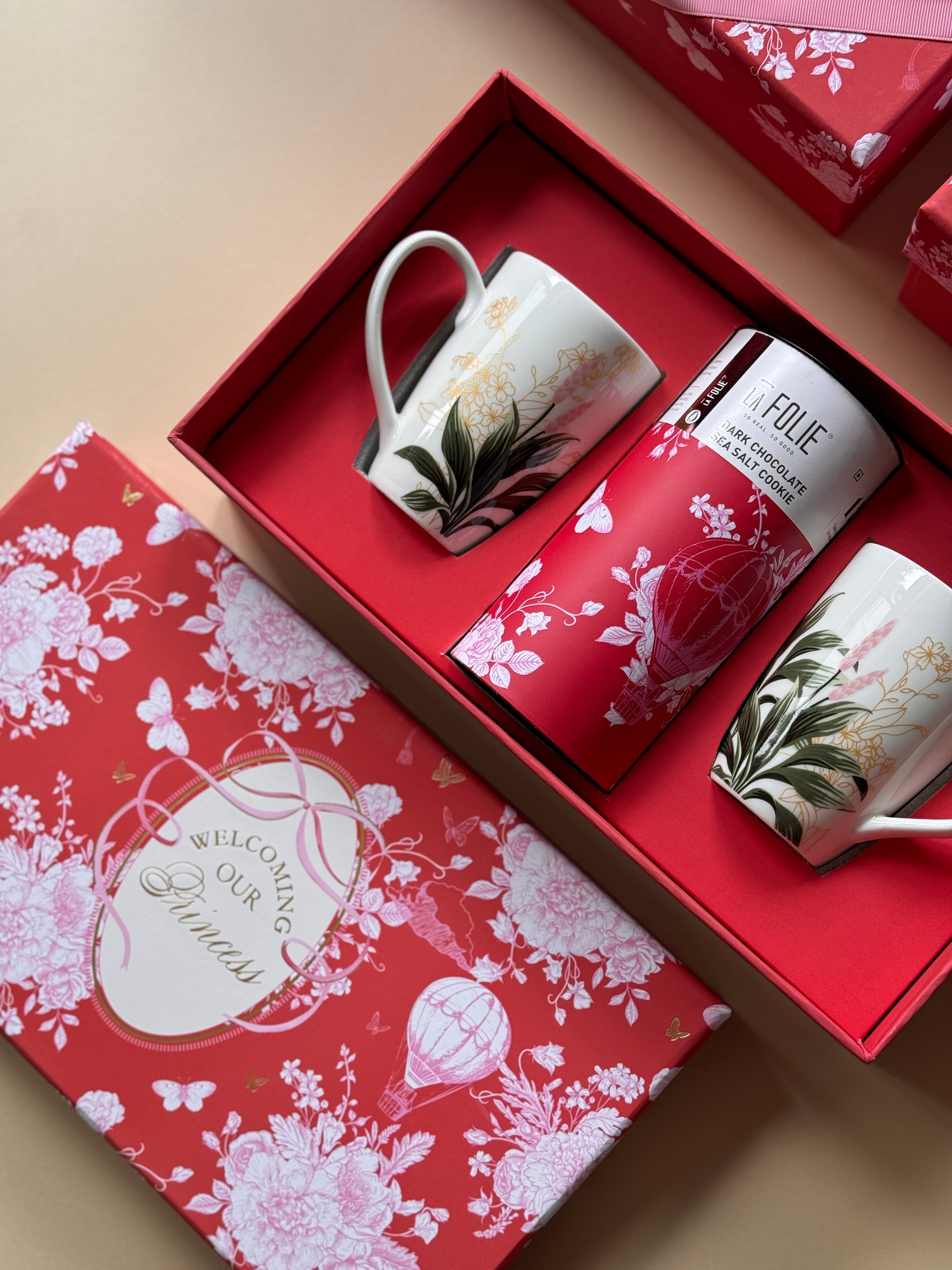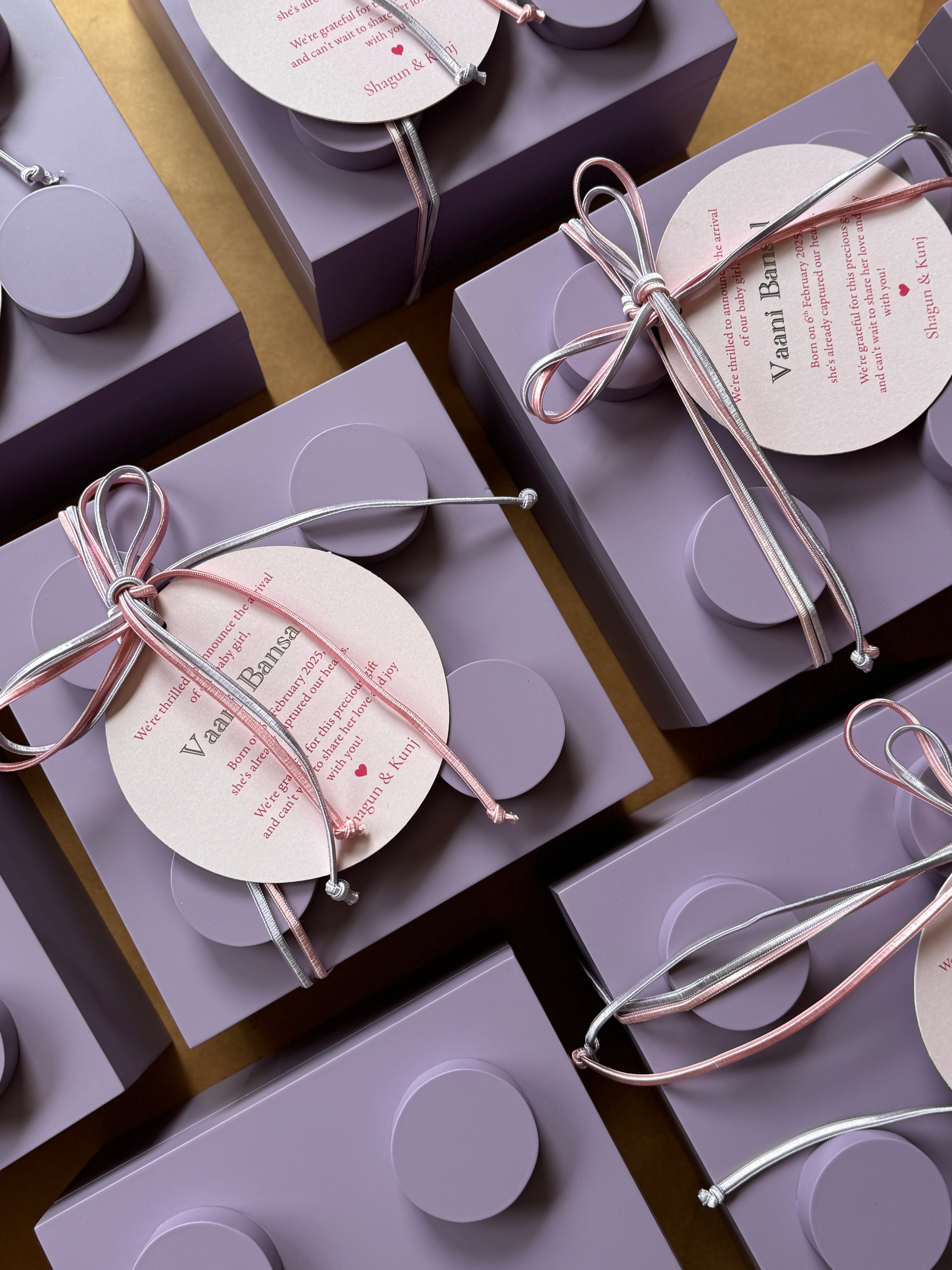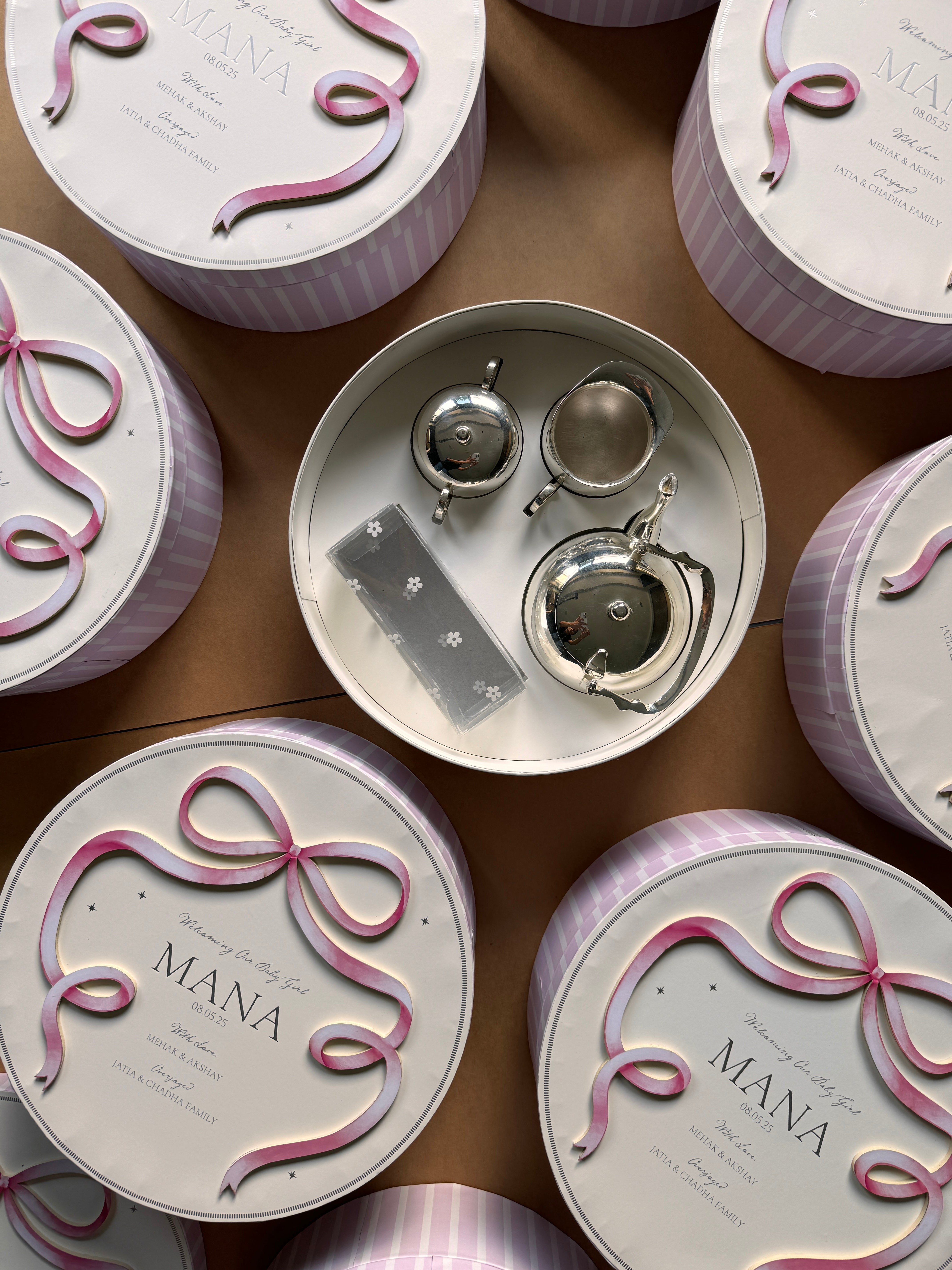 A bespoke box designed around the meaning of a baby’s name — with candles, books, and chocolates chosen with intention.