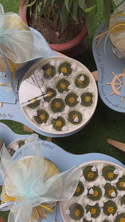 A nautical-inspired platter engraved with a quote, crafted in soft blues and gold foiling for a baby boy’s arrival.